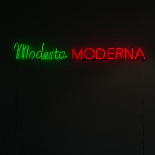 Ces termes sont communément utilisés par des femmes d’un certain âge en Italie pour désigner d’autres femmes. Modesta incarne une idée vertueuse de discrétion et de sobriété. Moderna semble qualifier une forme de progressisme et de liberté alors qu’il peut être utilisé péjorativement pour parler d’une jeune fille ou femme aux attitudes jugées transgressives, non conformes, aux yeux de certains réactionnaires : refus d’un machisme ambiant, recherche d’indépendance, relégation de pratiques religieuses. « Modesta Moderna » existe aussi en néon rouge et vert, comme enseigne lumineuse d’une table d’hôtes performative et est exposée de façon permanente au Bridderhaus.